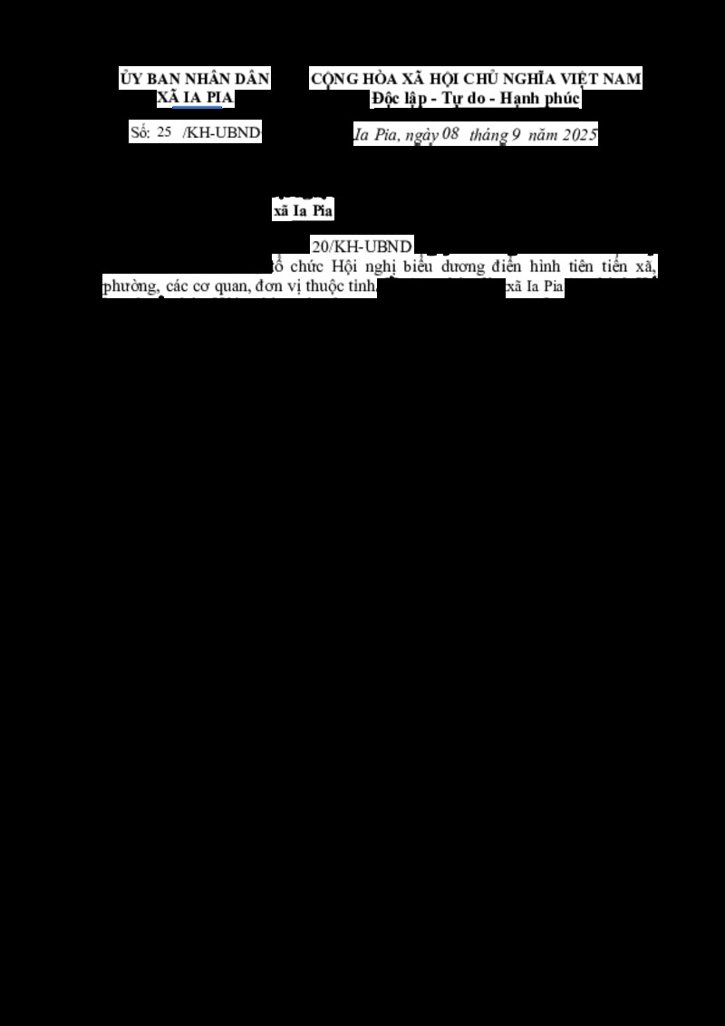Kế hoạch tổ chức Hội nghị tuyên dương điển hình tiên tiến xã Ia Pia lần thứ I (2025-2030) 10/09/2025, 13:43:49 - Lượt xem: 2 Tweet Thêm vào danh sách Báo xấu Thông tin tài liệu Kế hoạch tổ chức Hội nghị tuyên dương điển hình tiên tiến xã Ia Pia lần thứ I (2025-2030)