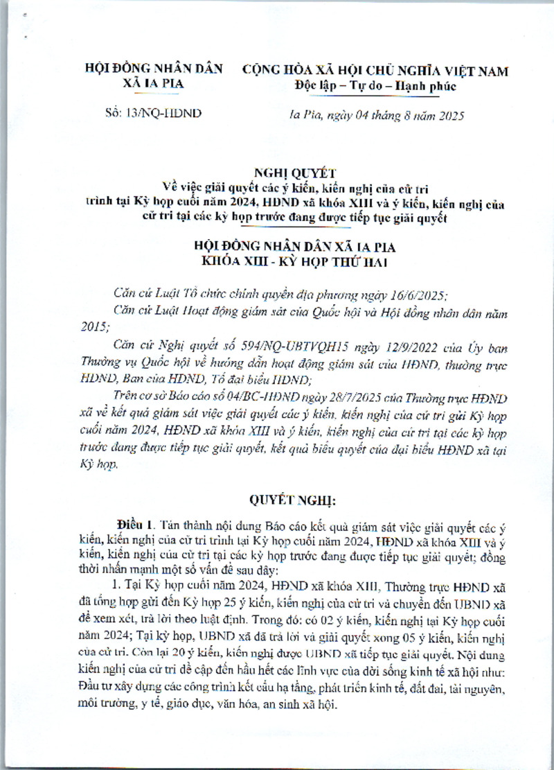 Nghị quyết về việc giải quyết các ý kiến, kiến nghị của cử tri trình tại Kỳ họp cuối năm 2024, HĐND xã khóa XIII và ý kiến, kiến nghị của cử tri tại các kỳ họp trước đang được tiếp tục giải quyết