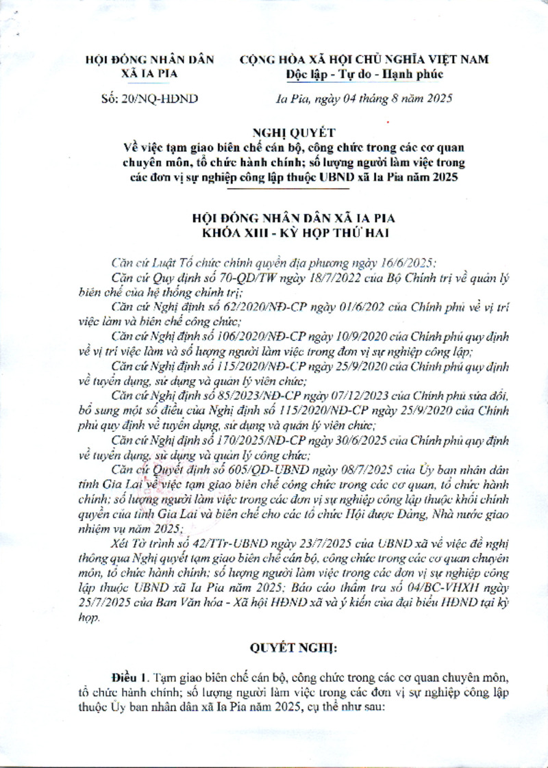 Nghị quyết về việc tạm giao biên chế cán bộ, công chức trong các cơ quan chuyên môn, tổ chức hành chính; số lượng người làm việc trong các đơn vị sự nghiệp công lập thuộc UBND xã Ia Pia năm 2025